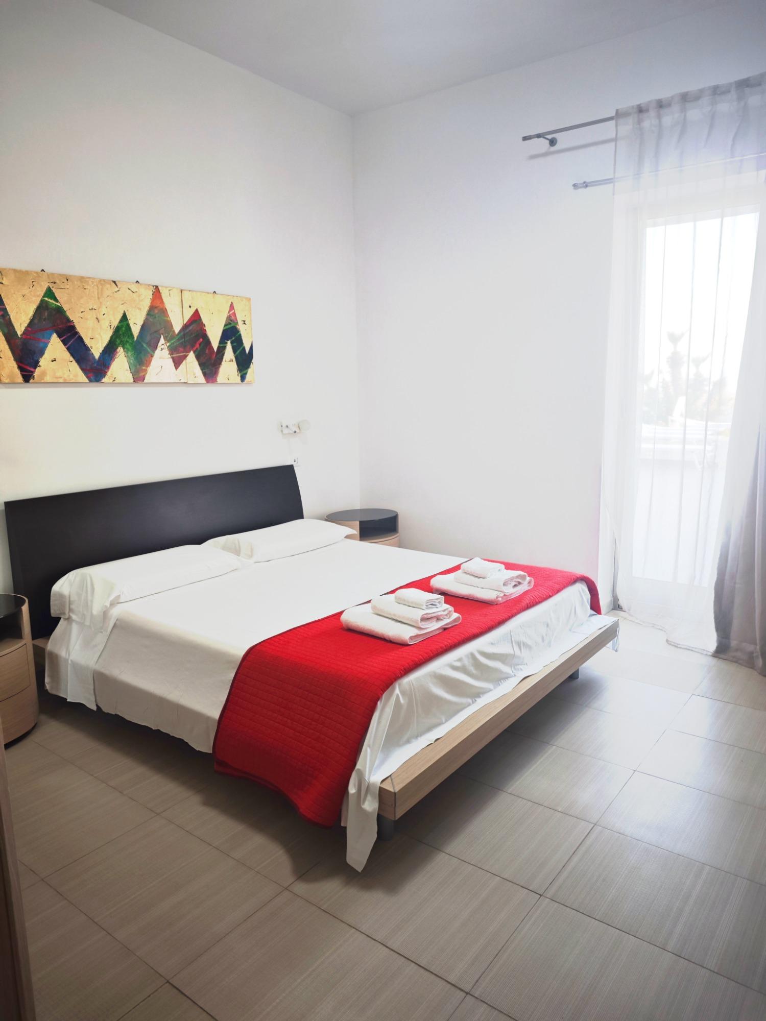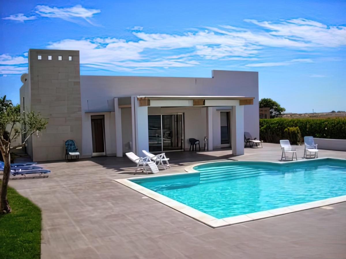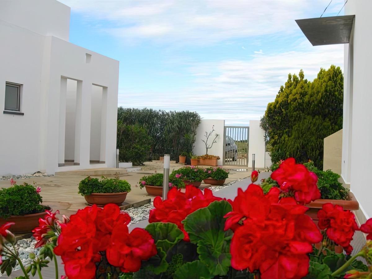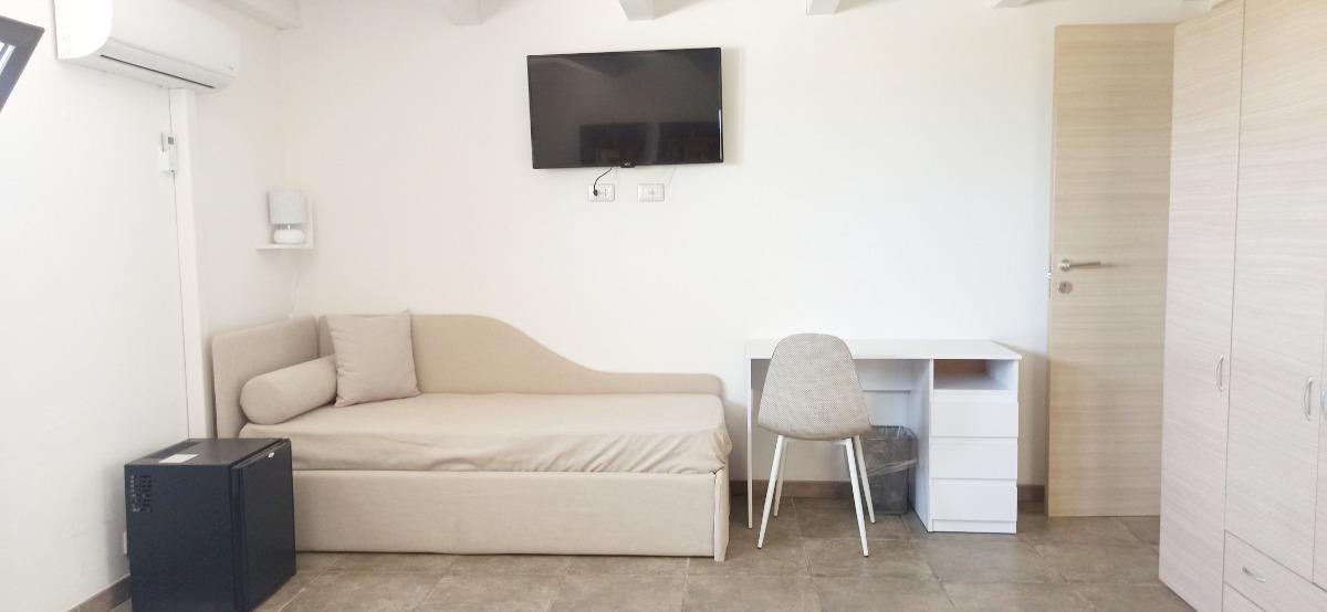 The exterior of Torrefano B&B resembles that of an ancient fortification, but with a contemporary twist. The one-story building boasts a spacious outdoor patio equipped with a pool, sun loungers, and surrounded by a Mediterranean garden filled with beautiful flowers and plants such as sterlizie, oleanders, laurels and dwarf palms.